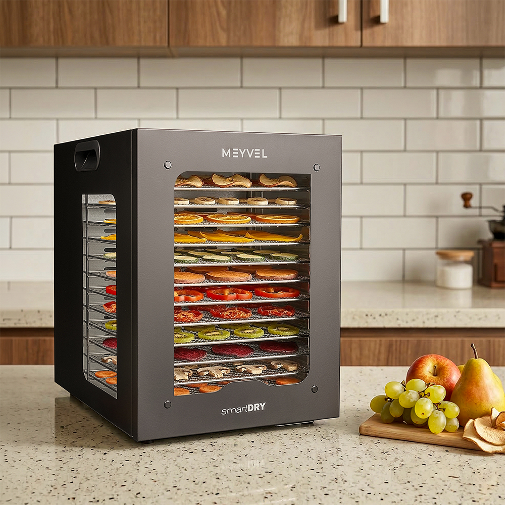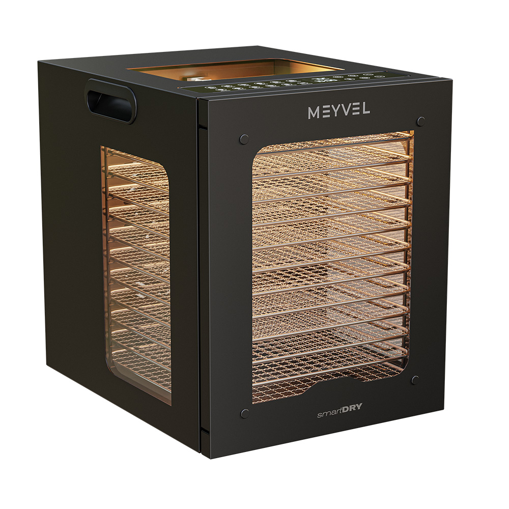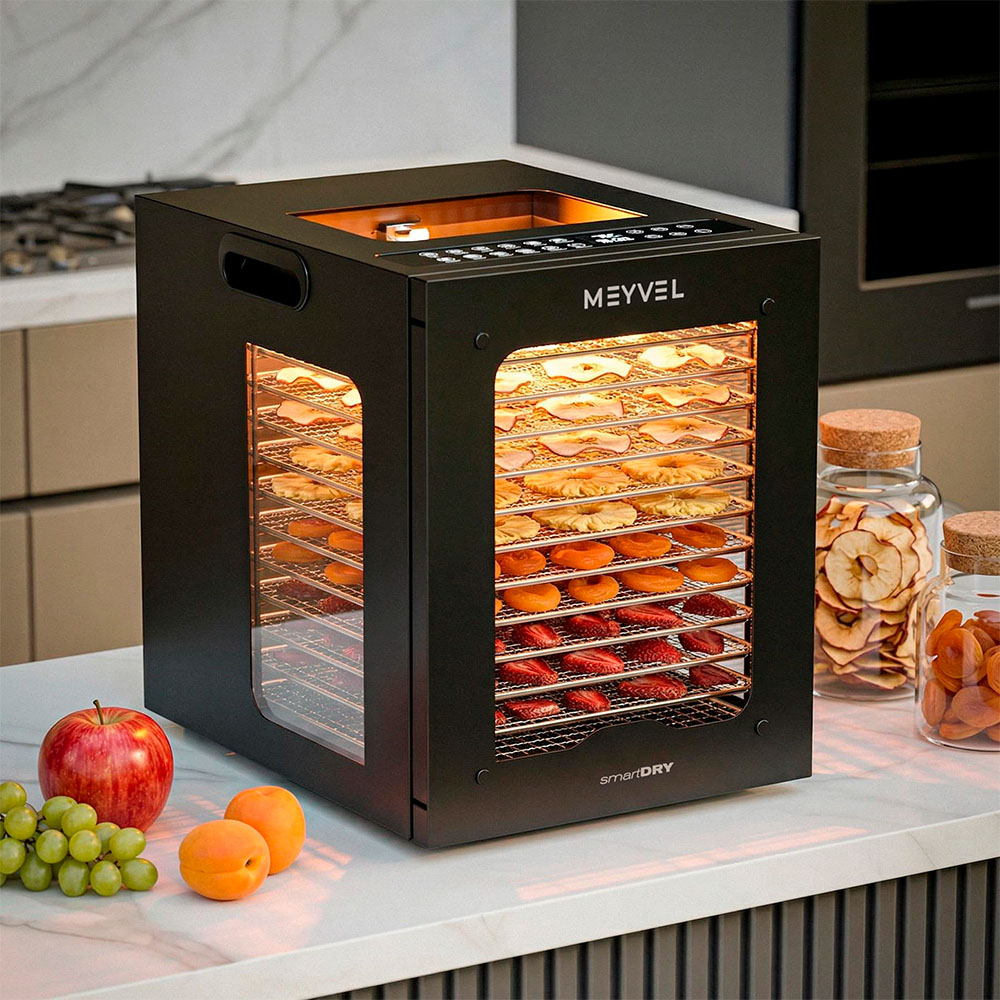 Meyvel MDH12-2S (Чёрный) (Black) — это современный дегидратор, который создан для тех, кто хочет заготавливать фрукты, овощи, мясо, травы и ягоды без потери их вкуса и пользы круглый год. Прочный корпус, продуманная конструкция и умная электроника превращают его в надёжного помощника на каждый сезон.