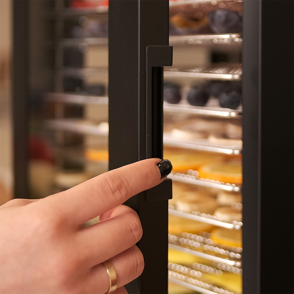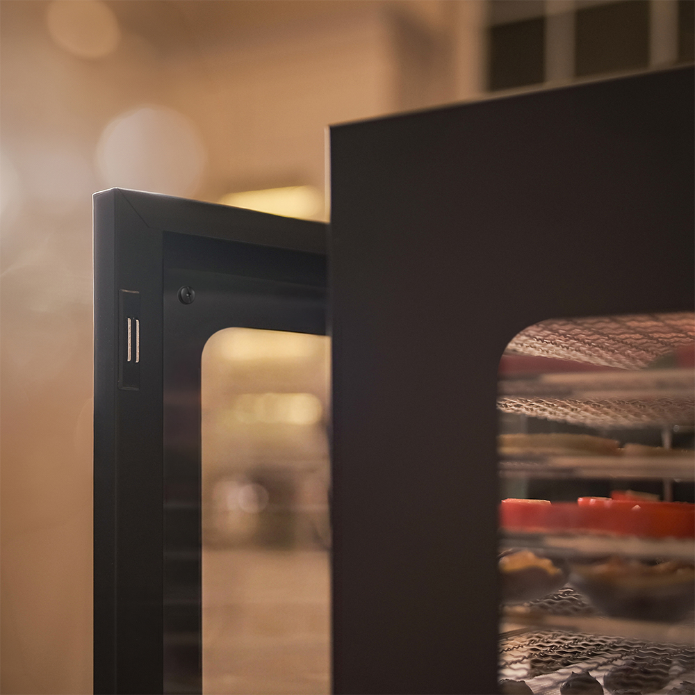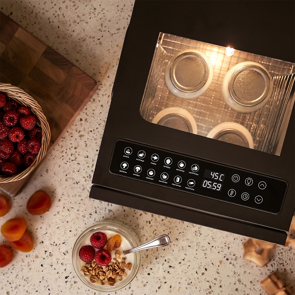 Чёрный корпус из нержавеющей стали, устойчивый к нагреву, влаге и коррозии, выглядит лаконично и современно, легко вписывается в интерьер кухни или мастерской. Внутри установлено 12 поддонов из нержавеющей стали с зазором 25 мм — этого достаточно, чтобы удобно размещать ломтики фруктов, травы или мясные полоски.