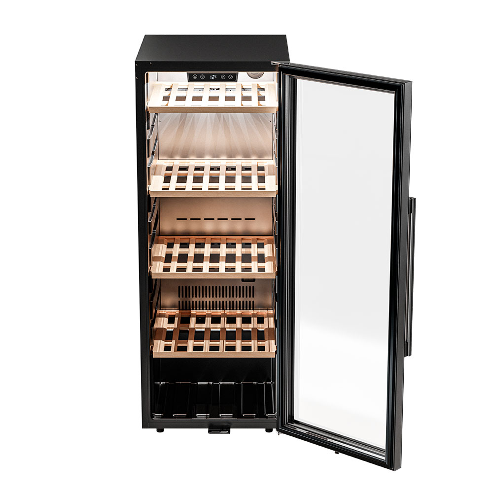 Модель MV105-KBF1 оснащена компрессорной системой охлаждения, которая отличается высокой эффективностью и долговечностью. Компрессор создает холод, путем сжатия хладагента и его последующего расширения, поэтому винный шкаф быстро достигает нужной температуры и стабильно ее поддерживает.